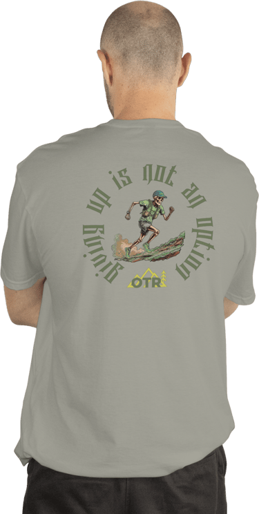 Con el lema Trail or Die y un espectacular gráfico de un esqueleto trail runner dándolo todo sobre el terreno, enmarcado por el mantra de los que nunca se retiran: "Giving up is not an option".